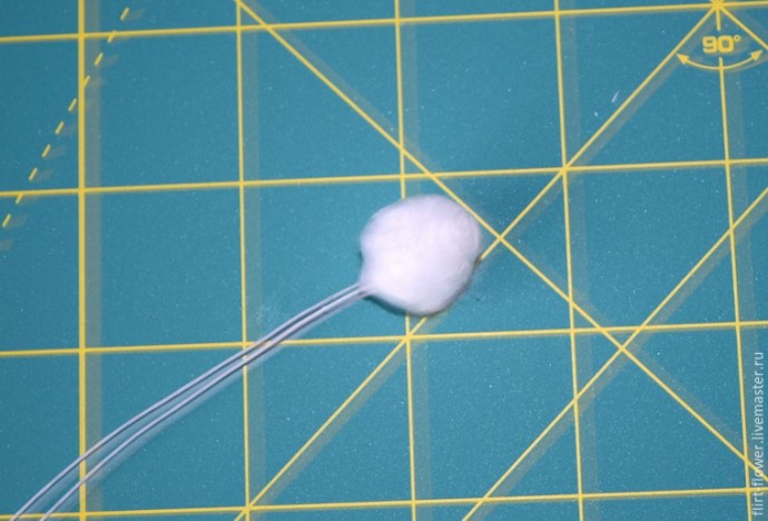 На ватную заготовку приклеиваю два круглых лепестка, чтобы закрыть ее и постепенно начинаю обклеивать маленькими лепестками, располагая их загнутыми кончиками внутрь (смотрю в середину цветка).