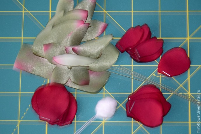 Приклеиваю средние лепестки также и затем самые большие, накладывая их один на другой (смотрю на цветок сбоку).