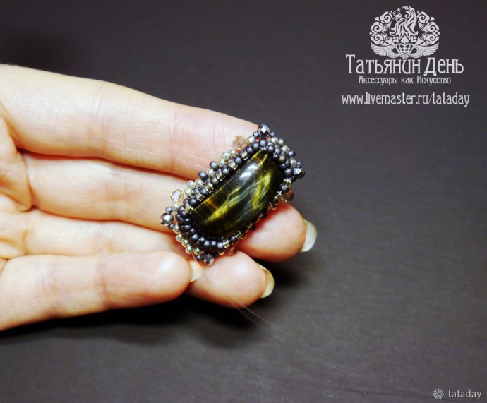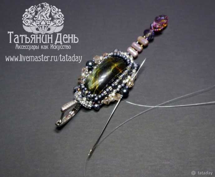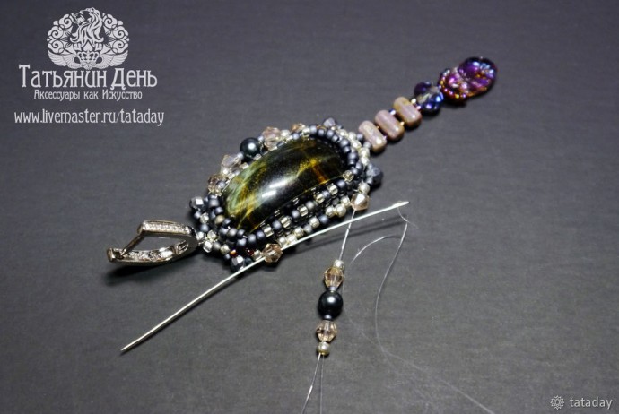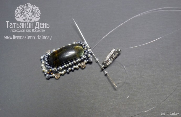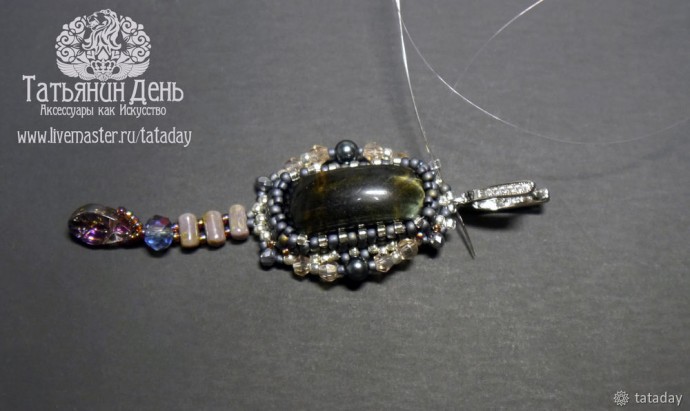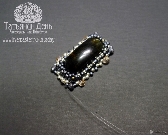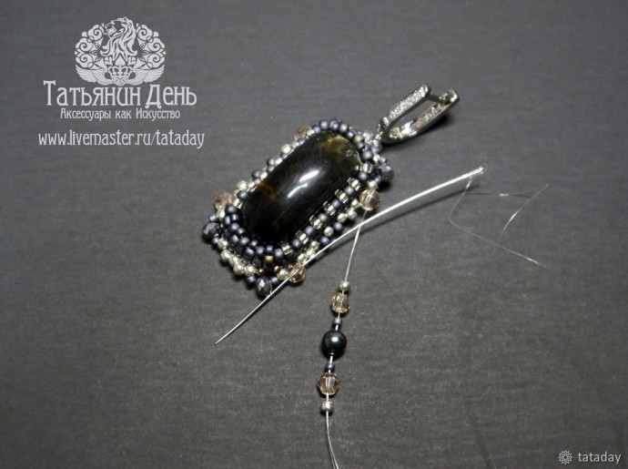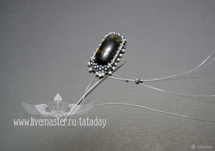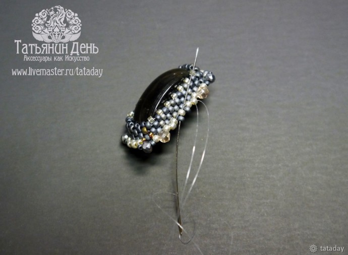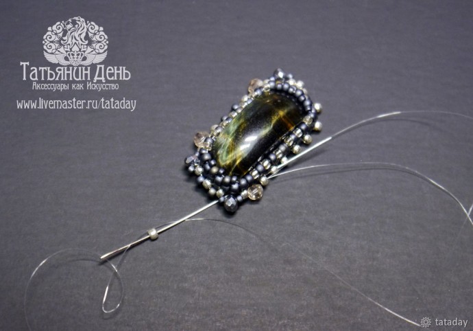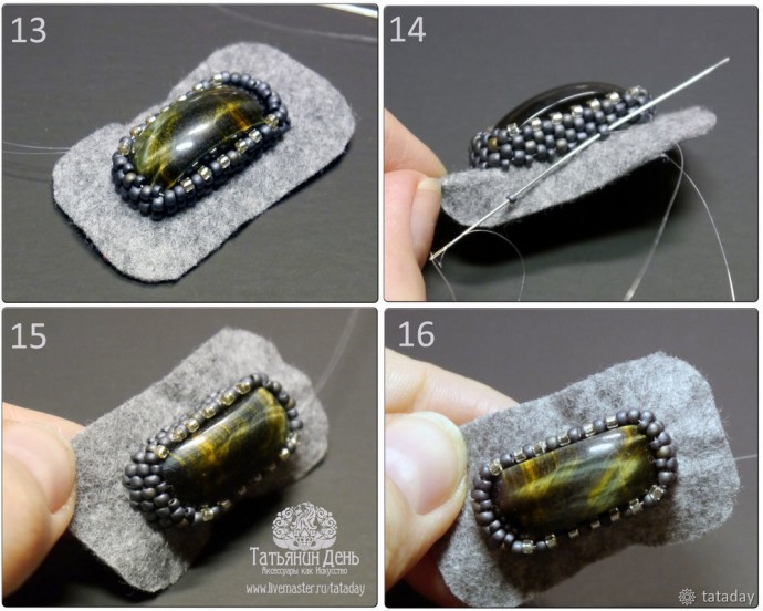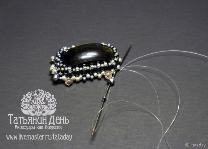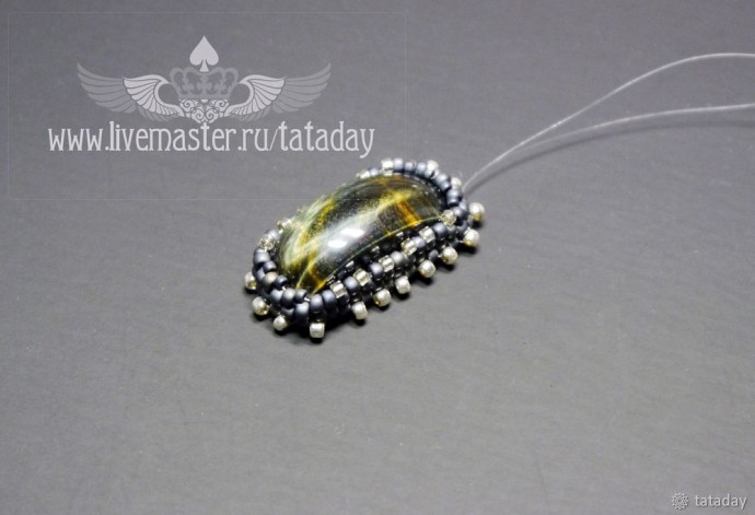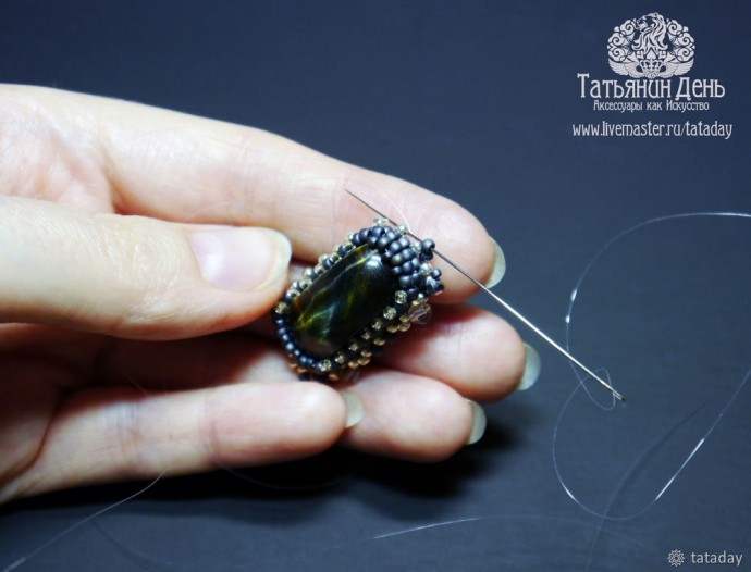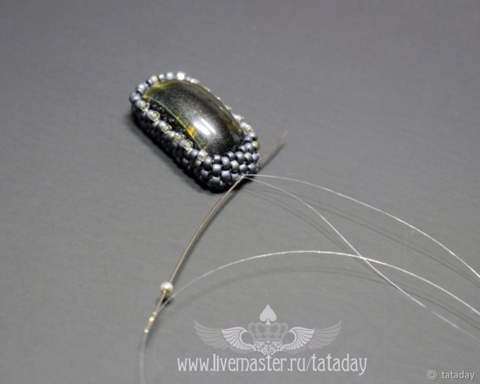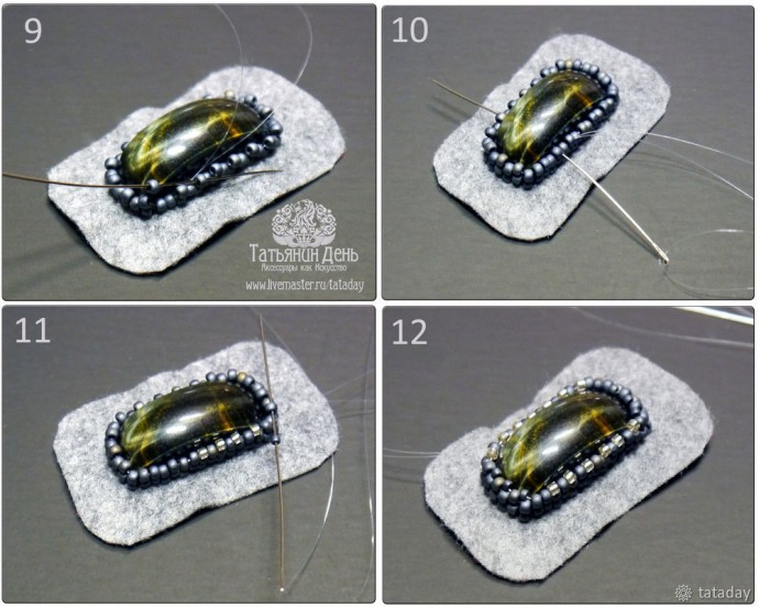 Начинаем оплетку бусины (фото 7). Иглу выводим из любой бисерины первого ряда, набираем 1 бисерину и вводим иглу через одну бисерину. Таким образом плетем 2 ряда, затягивая нить. На фото 10 показано как можно дополнительно закрепить оплетку. Из любой ближайшей к отверстию бисерины иглу вывести через него насквозь и прошить через бисерины противоположного края оплетки. Продолжить оплетку можно бисером контрастного оттенка. В углах я использую бисер 15 размера, чтобы лучше затянуть мои бусины-кабошоны сложной формы (фото 11).