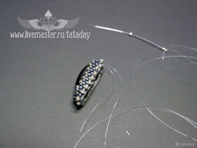 В этом месте будет закреплена швенза. Набираем 1 бисерину, швензу и еще 1 бисерину, выводим иглу из бисерины 11 размера оплетки. Проходим несколько раз в круговую, тем самым укрепляя и бисер с краю и швензу.
