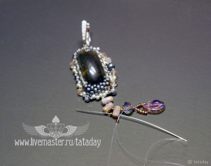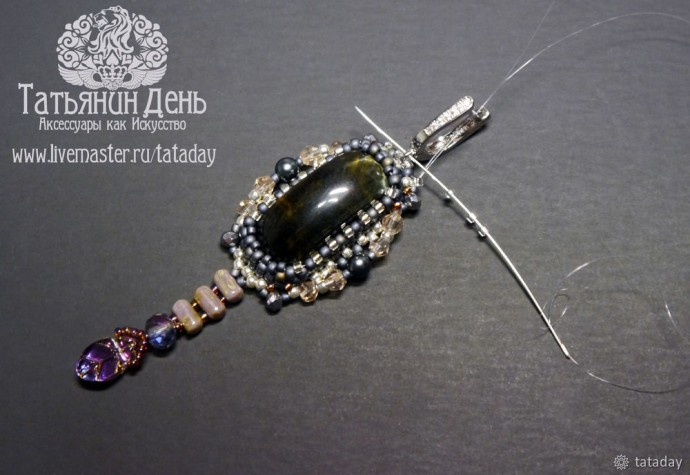 Завершаем плетение подвески, возвращаясь в оплетку бусины