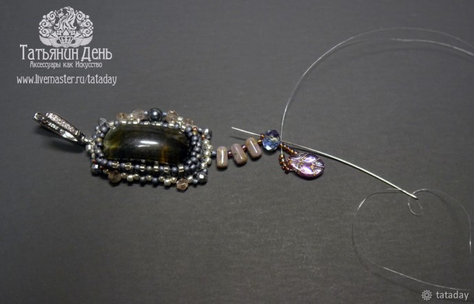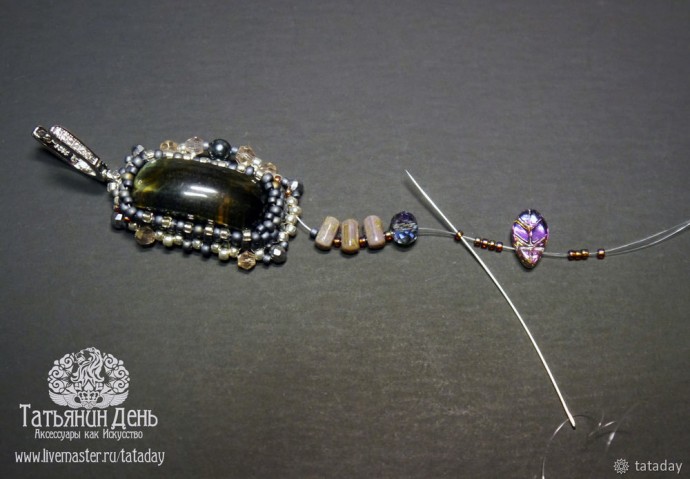 Красивые бусины — стоит слегка наклонить, и видна иризация при искусственном освещении. Проходим по всем бисеринам и бусинам и выводим иглу на противоположной короткой стороне из бисерины 11 размера.