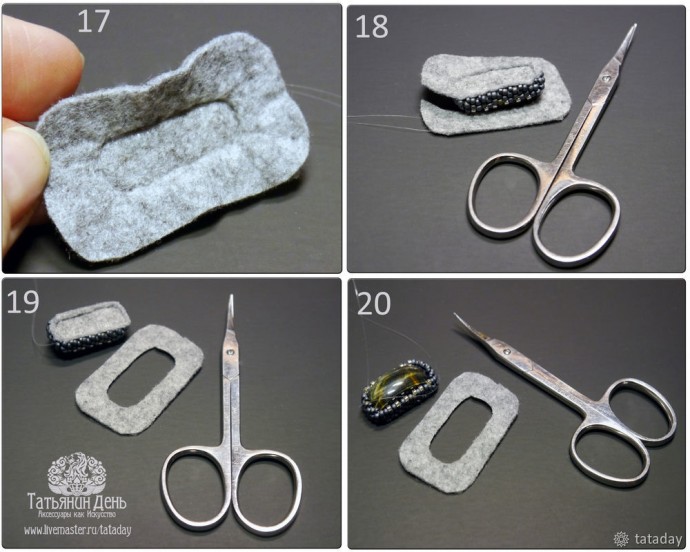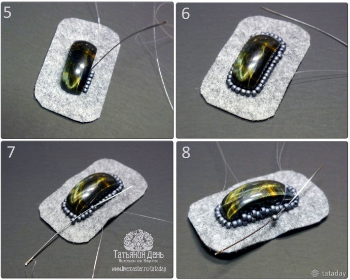 Подготавливаем кабошоны — при необходимости шлифуем заднюю поверхность для лучшего приклеивания к фетру. У меня в бусинах имеются отверстия, пришиваем их прочно к основе, как показано на фото 1 тройными (и более) стежками с небольшим отступом, тем самым бусина будет прочно закреплена. Выводим иглу близко к краю фото 2.