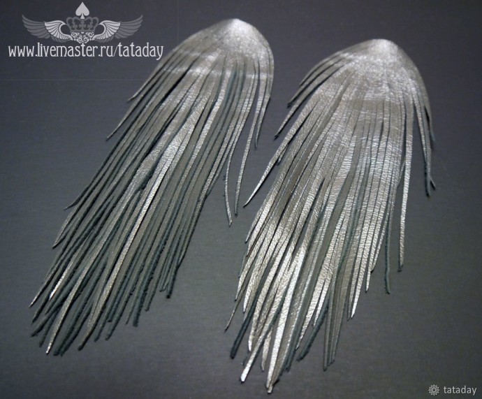Из кожи вырезаем две заготовки каплевидной формы шириной 4 см, длиной 12 см. Нарезаем каждую тонкой лапшой, начиная от узкого края к более широкому, не прорезая до конца.