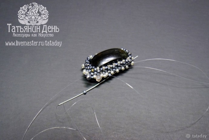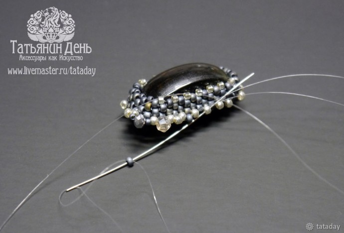 Начинаем обшивать бусину бисером 11 размера, набираем по 2 штуки и швом назад иголку проходим по всему периметру.