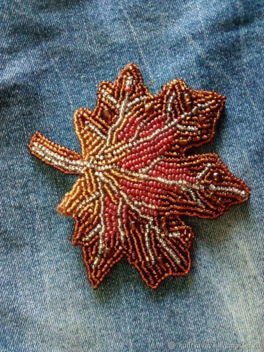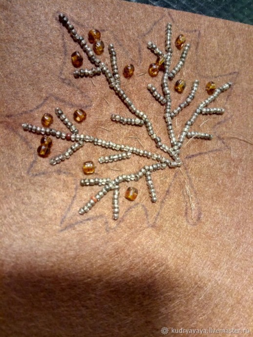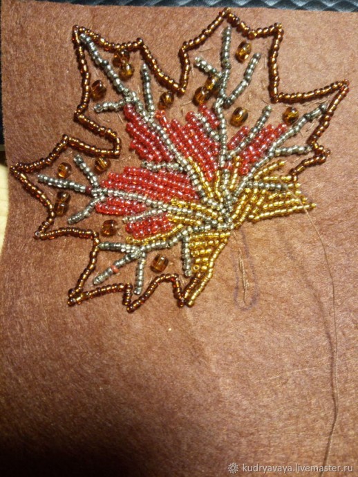 5. Начинаем с помощью шва «назад иголкой» заполнять (вышивать) элементы кленового листка. Например, сначала заполним прожилки листка прозрачным бесцветным бисером. Нанизываем на иголку по две бисеринки и продвигаемся по прожилкам. Затем начинаем заполнение по цветам: жёлтый, коричневый, красный. Аналогично пришиваем крупные коричневые бусины как в цвет основного коричневого цвета на концах листка.