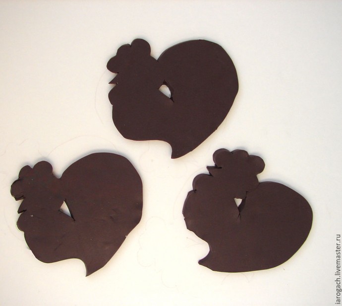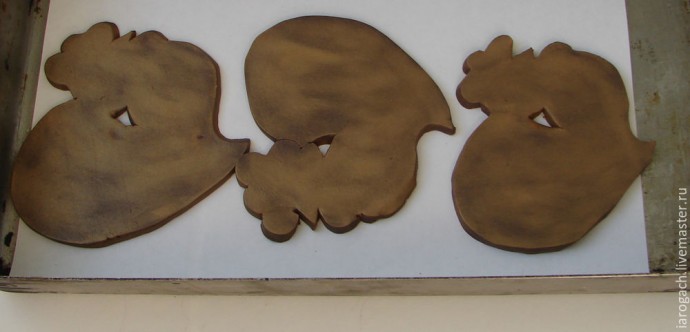 Я использовала паста-машину, но глину можно раскатать обычной стеклянной бутылкой. Причем идеально ровная поверхность и однородная толщина здесь не обязательны. Поэтому, даже если вы и новичок в работе с глиной, не переживайте по поводу небольших изъянов. На данном этапе нам нужна приблизительная форма, которую мы наполним неповторимым содержанием. Теперь, используя наш шаблон, вырезаем петушков. Удобнее всего пользоваться макетным ножом с его острым кончиком, но и тонкий канцелярский нож тоже подойдет.