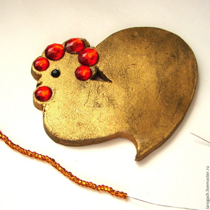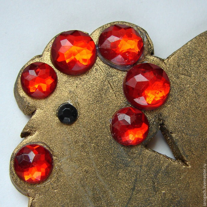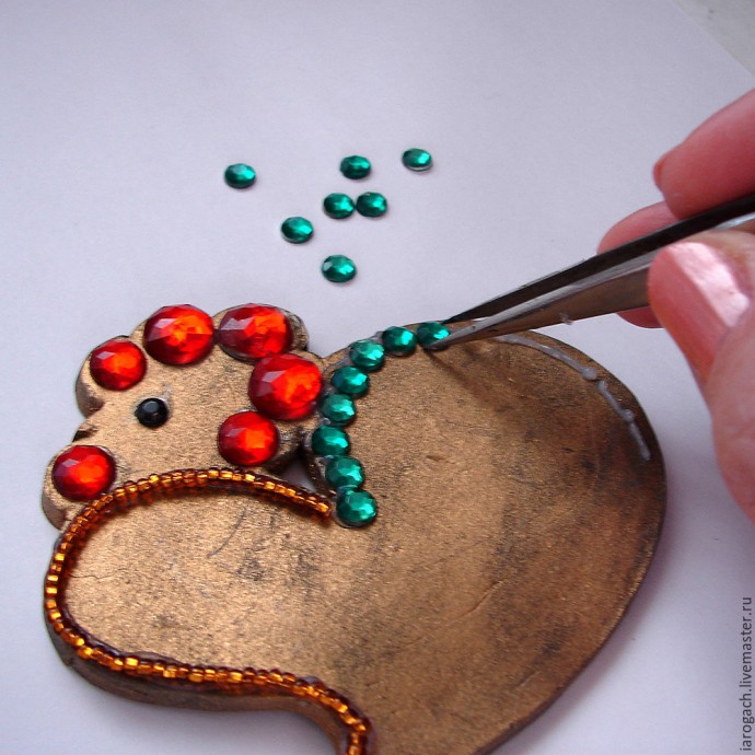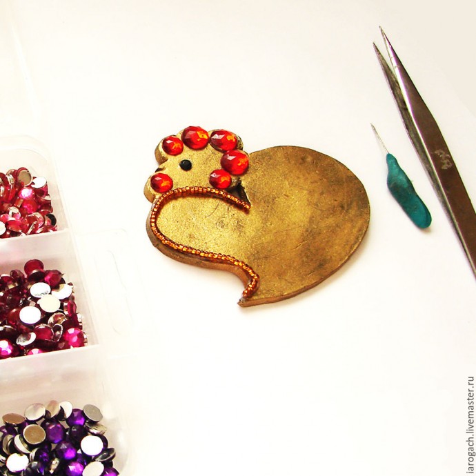 Потом из красных стразов компонуем гребешок и бородку. У меня стразы двух размеров, но можно и одинаковые.