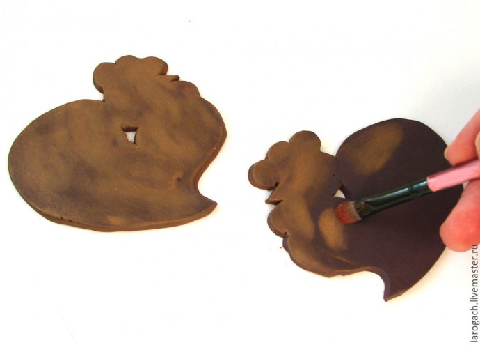 - полимерная запекаемая глина любого производителя (Fimo, Sonnet и так далее). Если полимерами когда-нибудь занимались, можно использовать остатки глины, цвет не принципиален, так как мы все равно ее будем тонировать. Если никогда с глиной не работали, достаточно будет приобрести один кусочек в магазинах для творчества. Тем, кто не хочет использовать этот материал, могу предложить создать основу из плотного картона, но сразу предупреждаю, вырезать петушков из картона будет намного сложнее;
