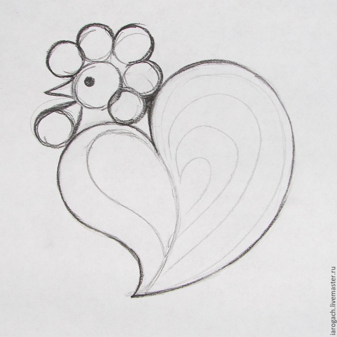Сначала сделаем эскиз нашего петушка. Мне хотелось обязательно вписать в его образ форму сердечка, поэтому сначала