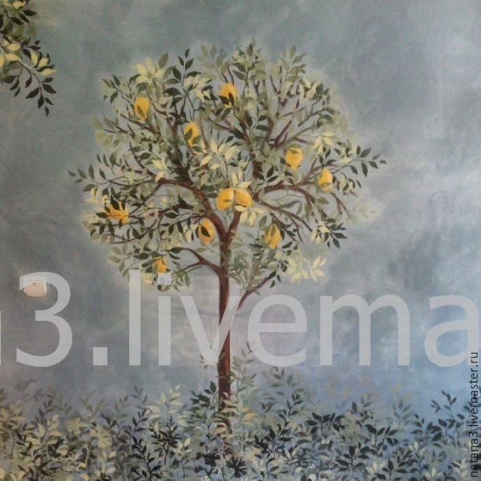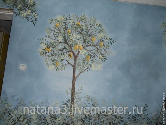 Когда высохла краска, приклеили малярным скотчем трафарет ствола дерева и маленьким валиком прокрасили все веточки.