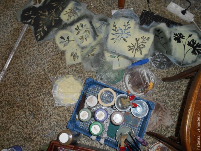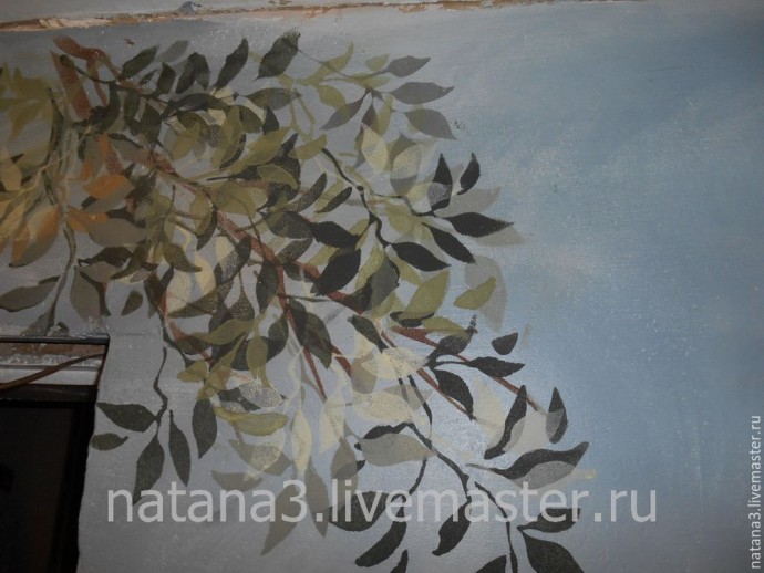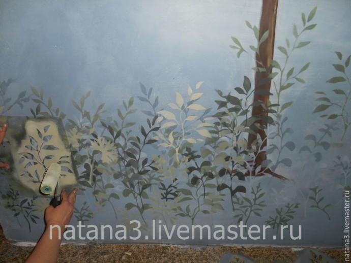 Точно так же, как и с трафаретом веточек, прикладываем трафарет с листиками и прокрашиваем листики полусухим валиком.