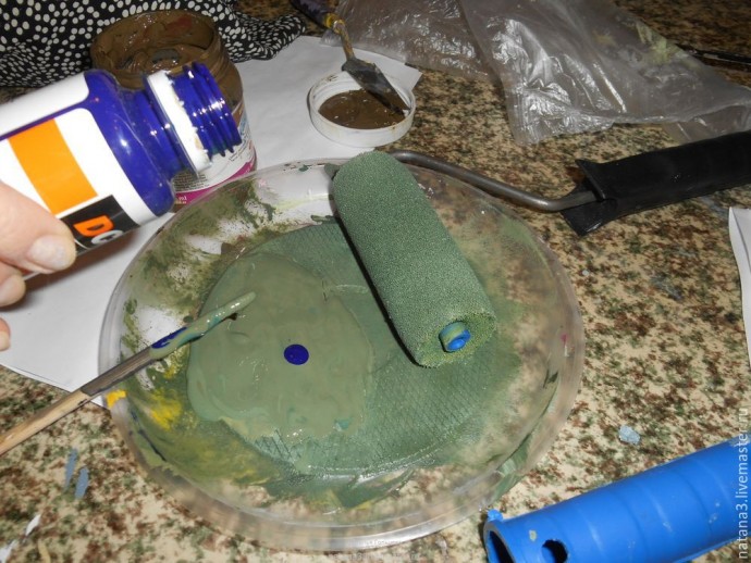 Все следующие веточки с листиками мы делали слоями. Чтобы придать объём кроне, на валик брали одновременно несколько оттенков зелёного с жёлтым, совершенно как придется, потому что этот слой был средним — так наращивали массу листьев.