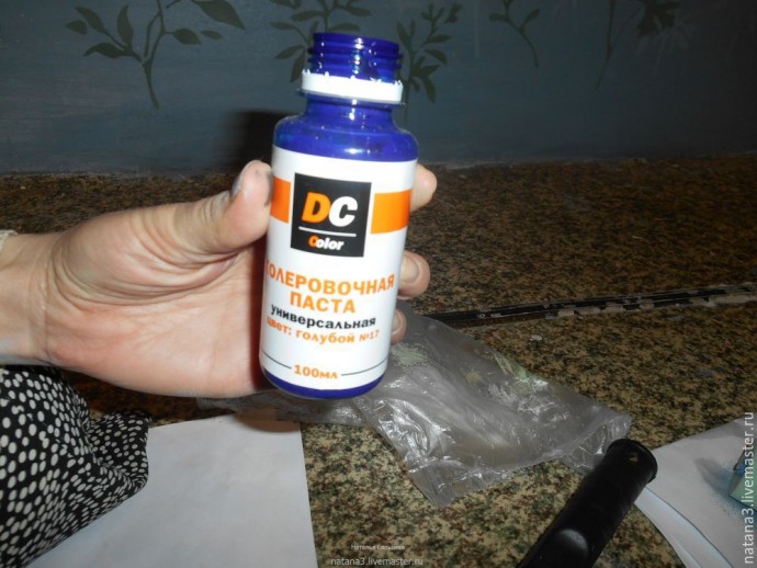 Колеруем эту же белую краску разными оттенками синего. Мы брали универсальные колеровочные пасты синего, зелёного и черного цветов, цвета охры и перемешивали между собой в разных сочетаниях и пропорциях — от тёмно-синего до светлого. Эти колеры тоже могут быть самыми простыми, главное, чтобы они сочетались по своему составу с краской, которую вы будете использовать.