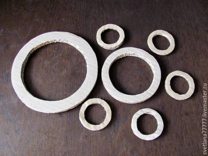В итоге из трёх больших колец получается одно, из трёх средних тоже одно, а из десяти маленьких (их надо склеить попарно) — 5 штук.