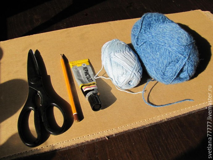 Материалы: шерстяная нить, хлопковая нить, ножницы, картон, клей момент кристалл, иголка, бусины деревянные, карандаш