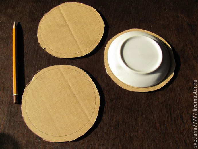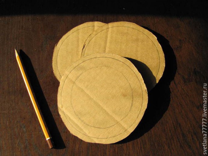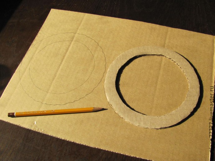 Мне почему-то в этот раз представился зимне-шерстяной. Пушистый. Тёплый и уютный. Поэтому для этого ловца я выбрала шерстяные и хлопковые нитки, те самые, что используются для вязания. \Теперь берём обычный картон, тарелку и обводим её три раза. Это для того, чтобы кольцо получилось трёхслойным, толстым и плотным.