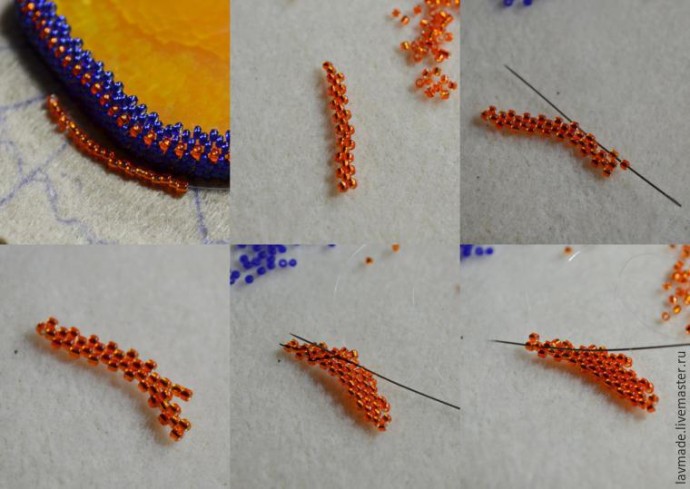 6. Когда первый ряд лепестков готов, начинаем второй, это будет контур нижней части вышивки, поэтому он располагается по самому краю нашего рисунка. Тут я плету по одному лепестку и тут же пришиваю. Начинаю набирать бисер, обязательно прикладываю его, чтобы определить длину.