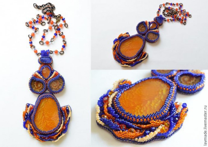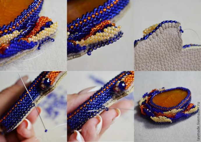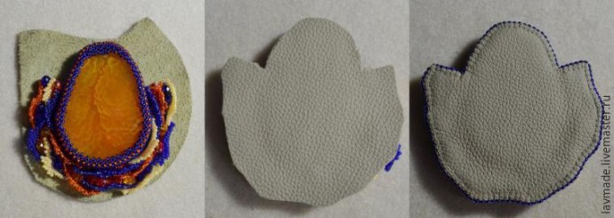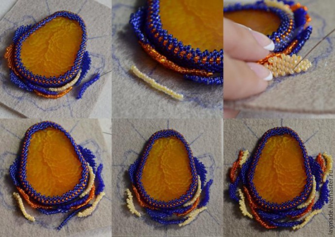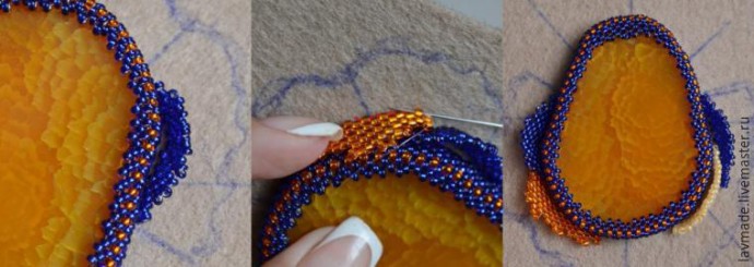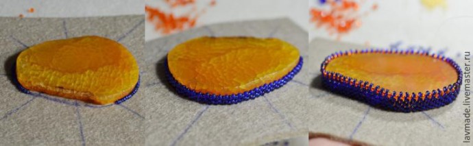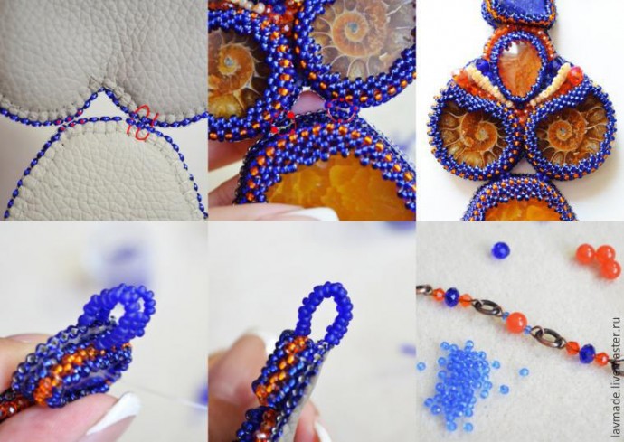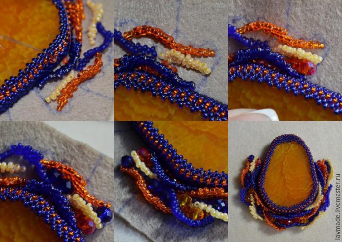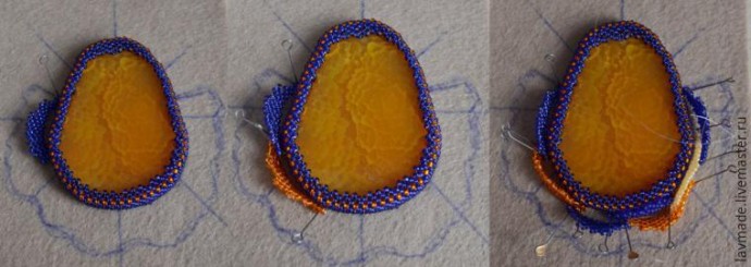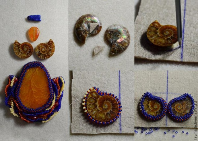 11. Далее обшиваем агат и лазурит. Формируем еще два лепестка из 15 бисеринки (зависит от размера аммонитов). Заполняем пустые места кристаллами. Вырезаем по форме и обрабатываем край.