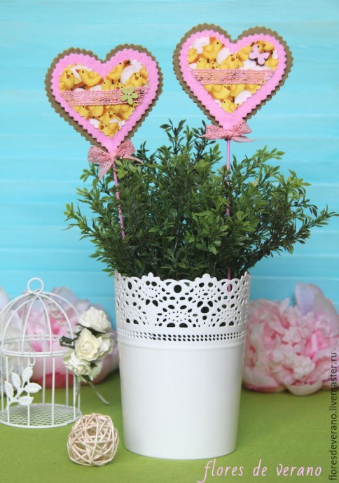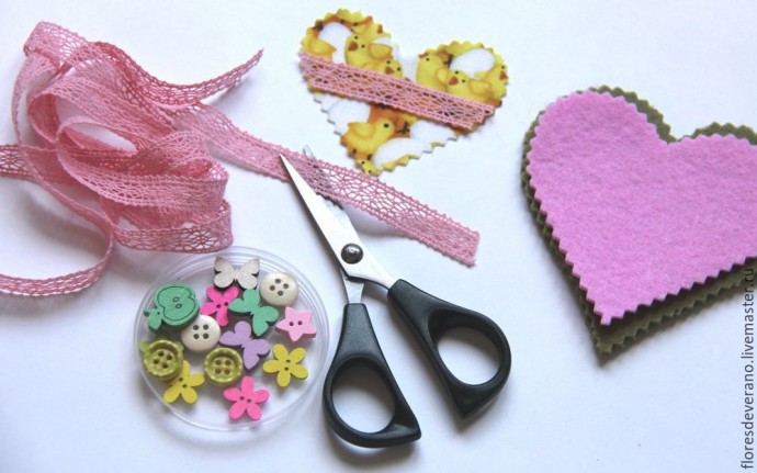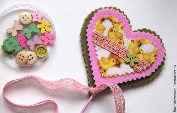 8. Затем наклеиваем хлопковое сердечко и последний штрих — завязываем у основания сердечка бантик из кружева, можно слегка закрепить его клеем.