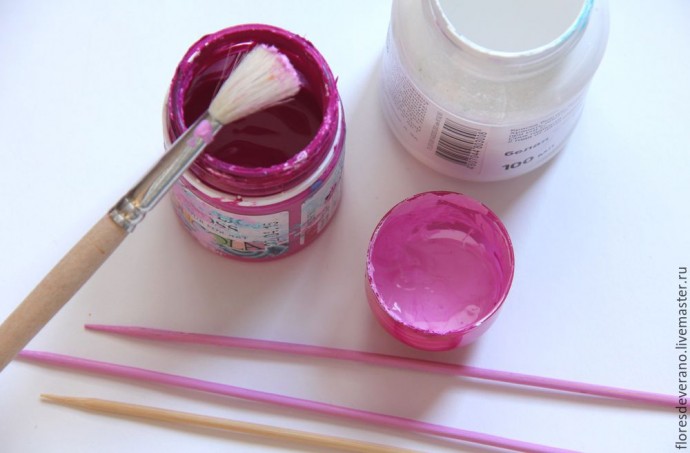1. Подготовим шпажки для нашего топпера. Для получения нежного оттенка розового добавляем белую краску в ярко-розовую. Красим шпажки и оставляем сохнуть (20 минут). Они понадобятся нам позже.