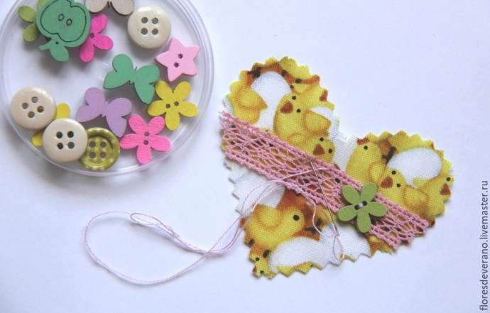 5. Пришиваем кружево и пуговицу к хлопковому сердечку.
