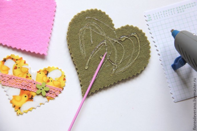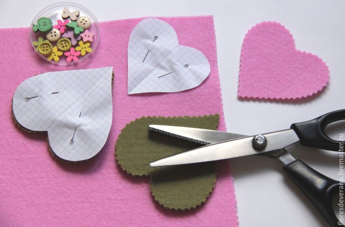 3. Тоже самое проделываем с фетром — сердечко среднего размера вырезаем из розового фетра, самое большое — из зеленого.