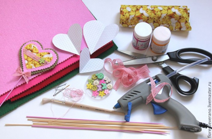 Материалы: ножницы, клеевой пистолет, фетр толстый, хлопок 100%, кружево хлопковое, пуговицы деревянные, шпажки, краски акриловые, булавки, иголка, нитки мулине