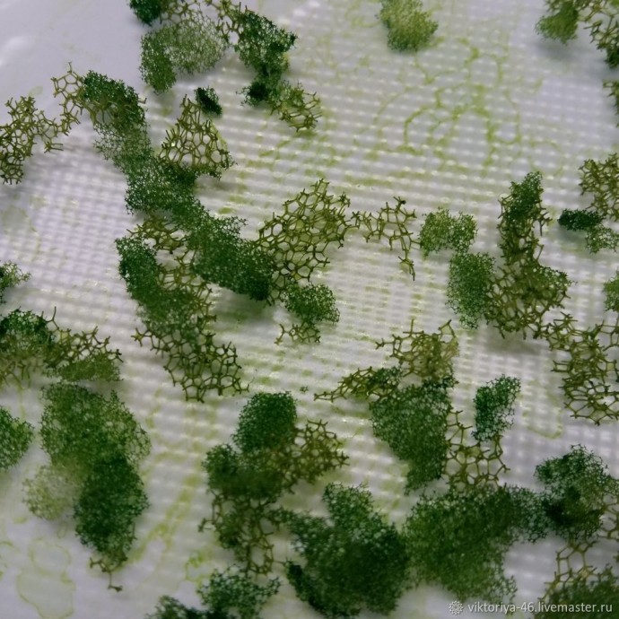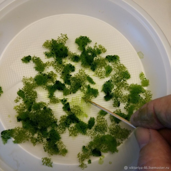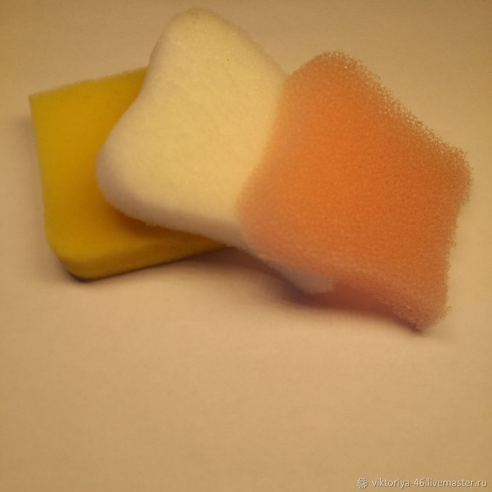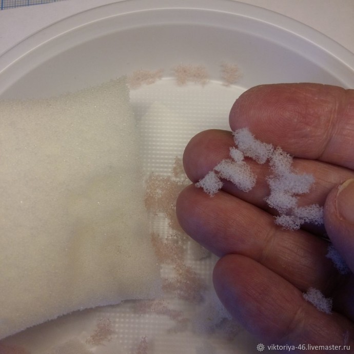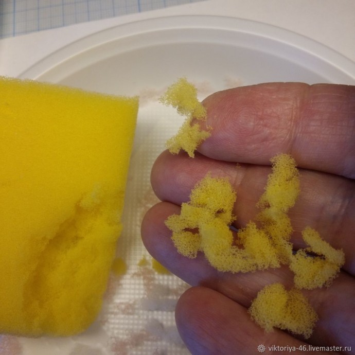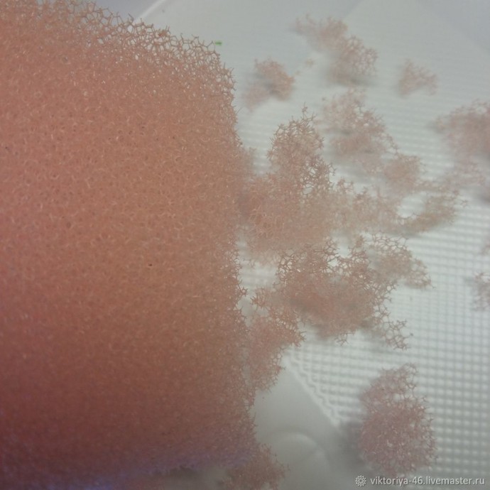 Для того, чтобы получился «мох» похожий на природный, я взяла несколько видов поролоновых губок. В отличие от «лишайника» эти губки должны быть мягкие. Розовая губка более пористая чем, белая и желтая. Я не стала нарезать поролон, я его щипала. Не обязательно он должен быть очень мелким, главное — он должен быть тонким.