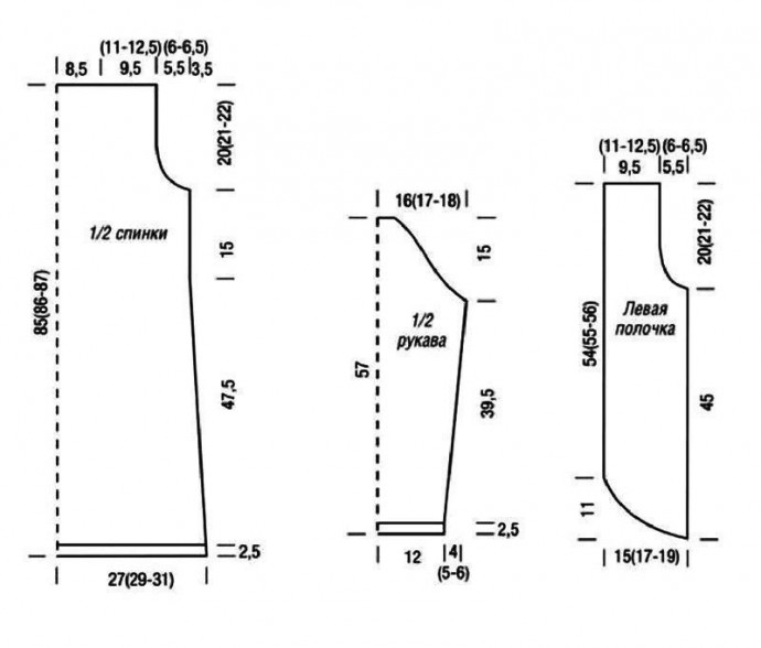 На спицы № 5,5 набрать 38 п., связать 2,5 см резинкой и вязать лиц. гладью. Для скосов рукава в 17-м (13-13-м) р. прибавить с обеих сторон 1 х 1 п., затем: попеременно в каждом 14-м и 16-м р. 4 х 1 п. (в каждом 12-м р. 5 х 1 п., затем в след. 10-м р. 1 х 1 п. - в каждом 10-м р. 7 х 1 п.) = 48 (52-54) п. Через 42 см от начала работы для оката рукава закрыть с обеих сторон 1 х 3 п., затем в каждом 2-м р. убавить 1 х 2 п., 3 х 1 п., в каждом 4-м р. 5 х 1 п., в каждом 2-м р. 2 х 1 п. и 1 х 2 п. (в каждом 2-м р. 1 х 2 п., 4 х 1 п., 8 каждом 4-м р. 4 х 1 п., в каждом 2-м р. 4 х 1 п. и 1 х 2 п. - в каждом 2-м р. 1 х 2 п., 5 х 1 п., в каждом 4-м р. 3 х 1 п., в каждом 2-м р. 5 х 1 п. и 1 х 2 п.). Через 15 см от начала оката рукава закрыть оставшиеся 14 п.