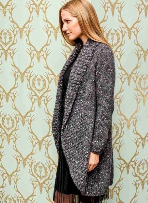 Выполнить с обеих сторон по 9,5 (11-12,5) см плечевых швов. Для планки застёжки по вертикальным краям полочек (от наборного края, по закруглению и вырезу горловины спинки) на круговые спицы № 5,5 набрать всего 283 (291-299) п. Вязать полупатентный узором. Через 20 см петли свободно закрыть лиц. Рукава втачать. Выполнить боковые швы и сшить рукава.