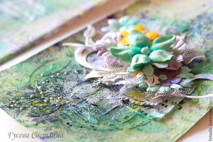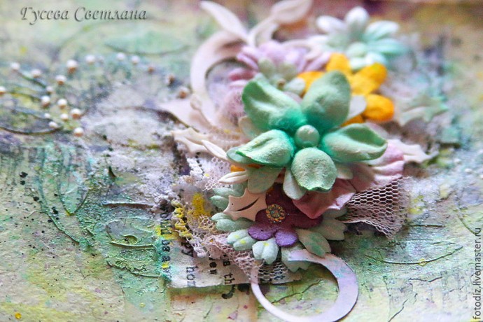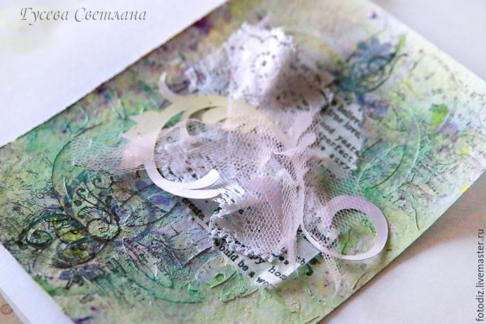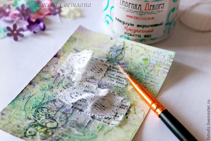 7. Приступаем к сборке композиции. Взяв прозрачный медиум (можно клей) я приклеила к фону кусочки газеты и кружева, а также завитки и цветочки. Собирала всё сразу и склеивала, так как в голове уже «нарисовалась идея композиции»