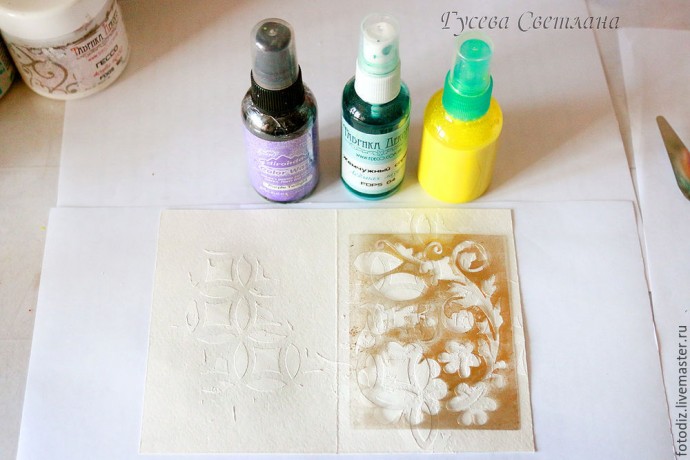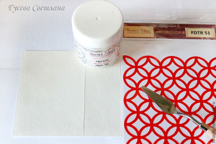 2. Берём гессо или текстурную пасту (можно и акриловый грунт, только он жидковат) трафарет, какой вы хотите. Я использовала такой орнамент, (мне он подошёл) наносим на бумагу и сушим.