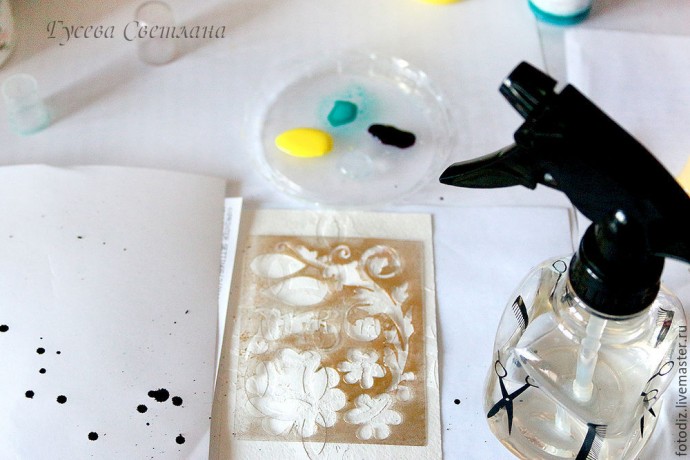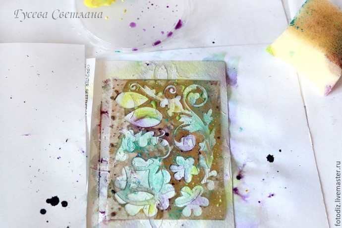 И так, я взяла жёлтый, мятный и темно-фиолетовый. Капнула понемногу на крышку из-под мороженного (я всегда собираю разные маленькие крышечки или поддоны пластиковые, они удобны для палитры и потом выкинуть не жалко). Немного сбрызнув бумажный фон водой, для того чтобы краски лучше легли и положила трафарет (правда он роли не играл никакой, но я подумала, пусть будет, чтобы краски не сливались сильно друг с другом) взяла губку и «методом тыка» стала наносить краску своих оттенков на фон.