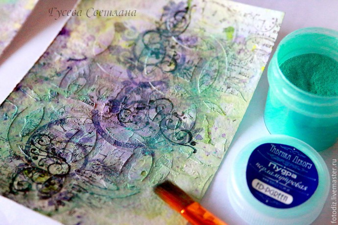 6. И ещё я взяла перламутровую пудру и нанесла её на фон (люблю перламутр) для создания эффекта перламутрового отлива и мятного оттенка. Затем всё просушила ещё раз и фон готов