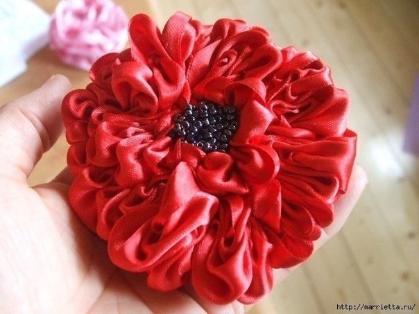 Цветы из атласных лентЦветы из атласных лент могут быть как украшением детали одежды, так и брошью.