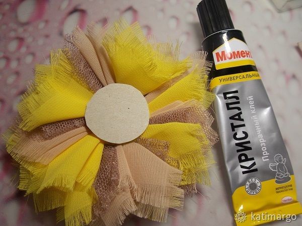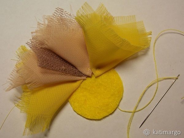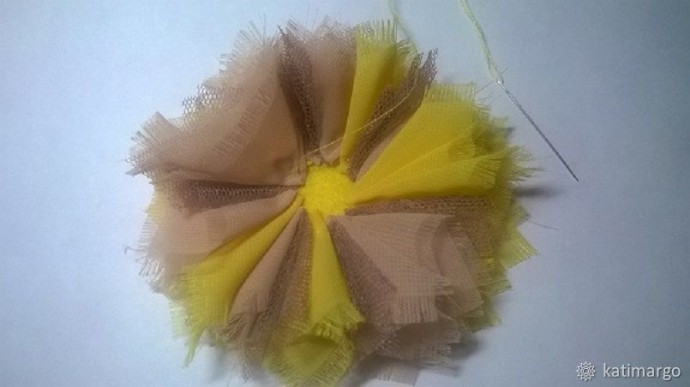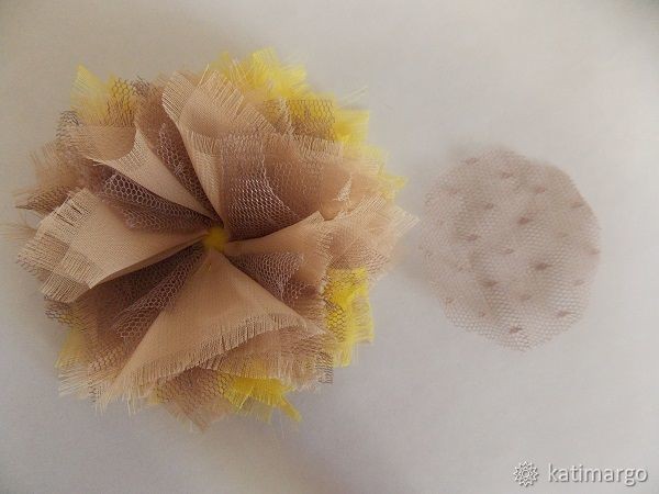 Нашиваем второй ряд. В данном случае только бежевый шифон и сетка поочередно. Также вырезаем круг из сетки и пришиваем его в центре.