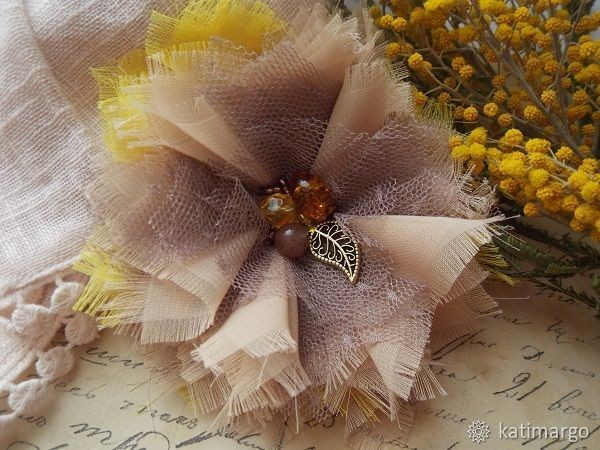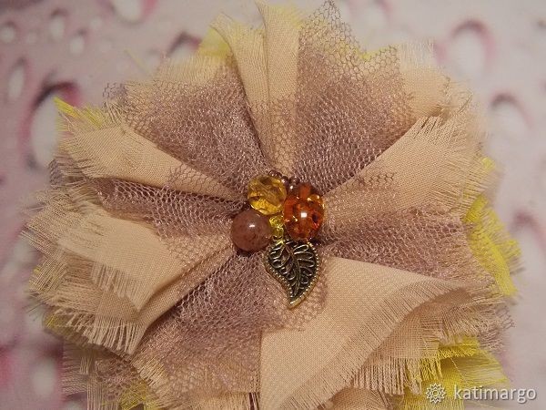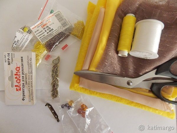Для работы понадобиться: шифон желтый и бежевый, ткань сетка, фетр в тон цветка, бисер, фурнитура, в моем случае бусина натурального янтаря и клубничного кварца.
