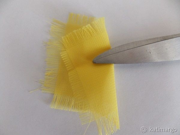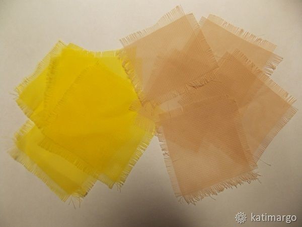 Вырезаем квадраты из шифона и ткани сетки размером примерно 5х5 см. По периметру квадрата у шифона вытягиваем нити и создаем бахрому по краям.
