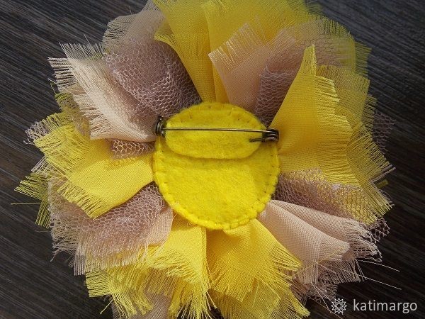 Нашиваем готовый круг с застежкой к основе на броши. Маленький кусочек фетра приклеиваем на застежку, прикрывая шов.