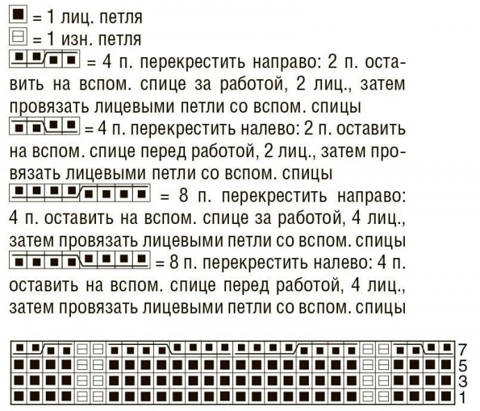 Работу продолжить, распределив петли узоров следующим образом: кром., 1 п. лиц. глади, 18 (22−26) п. структурного узора (начать с 2 изн., 2 лиц.), 28 п. узора из «кос», 18 (22−26) п. структурного узора (начать с 2 лиц., 2 изн.), 1 п. лиц. глади, кром.