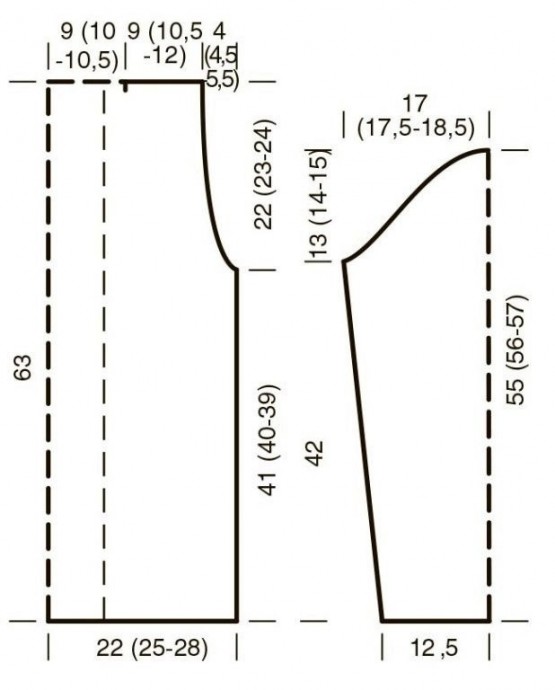 Через 22 (23−24) cм = 42 (44−46) р. от начала пройм закрыть с обеих сторон для плеч по 12 (14−16) п., оставшиеся средние 34 (36−38) п. горловины временно отложить.