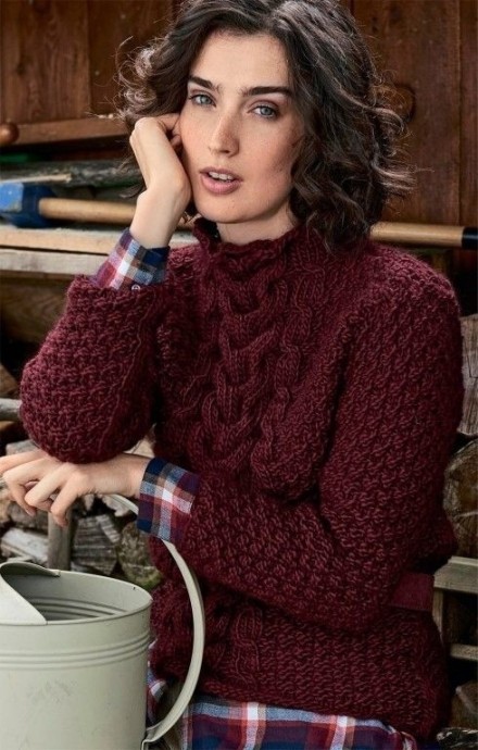 Плотность вязания 13 п. х 19 р. = 10 х 10 см, связано структурным узором спицами № 15; 28 п. узора из «кос» = 13,5 cм, связано спицами № 15.