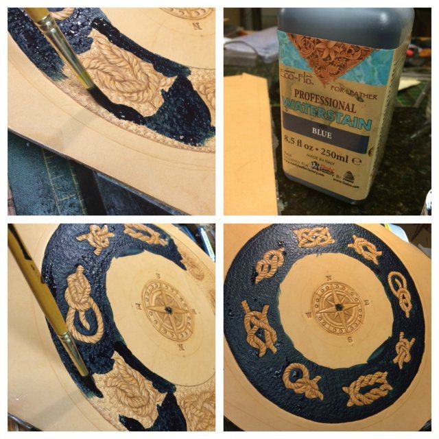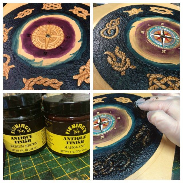 Теперь переходим к раскрасце центра. Центр я раскрашиваю разными красками, в том числе акриловыми фирмы Angelus. Очень красивые и насыщенные цвета. Для раскраски использую очень тонкие кисточки, к сожалению, не сильно тонкие какие мне хотелось бы. Затем ждем, когда все краски высохнут, покрываем все одним слоем Super Sheene и ждем когда высохнет... пока сохнет — можно пойти на перерыв, покушать, поспать или просто поработать над другим изделием. Когда высохнет (проверяется пальцем), можно наносить на морские узлы финишную пасту, которая создает эффект антика — в моем случае, это Fiebings Antique Finish, medium brown.