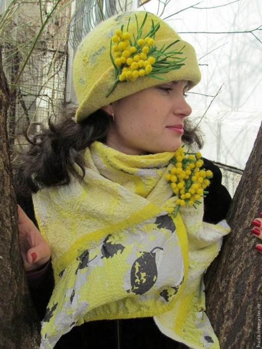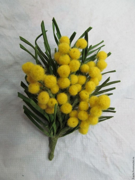 Вот что получилось. Прикрепив основу под брошь, можно украсить веточкой мимозы лацкан верхней одежды, головной убор, сумочку, махрушку для волос.
