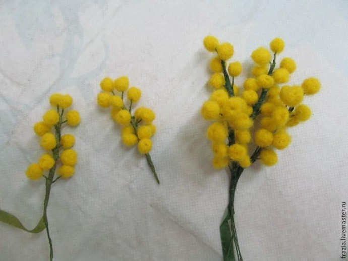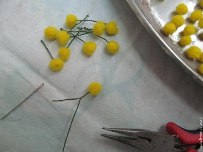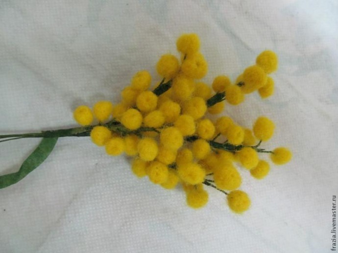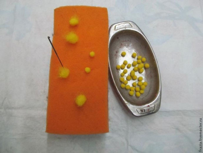На губке иголкой для валяния сваливаем шарики. Не старайтесь сделать одинаковыми, в природе эти удивительные цветочки одинаковыми не бывают. Сваливаете шарики достаточно плотно, но без фанатизма, они должны выглядеть пушистыми. Количество шариков должно быть достаточно большим , на каждую веточку я расположила по 14-16 пушистиков.