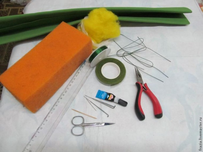 Материалы: шерсть для валяния, иглы для валяния, флористическая проволока, клей, фоамиран, тейп лента