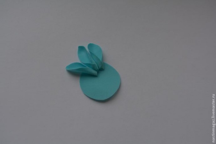 После этого каждому лепестку придадим законченный вид, склеив основание. То есть лепесток внизу сворачиваем трубочкой и склеиваем.