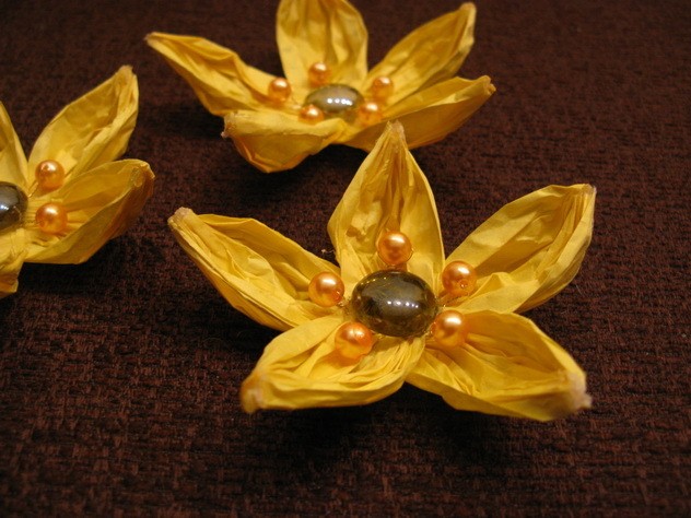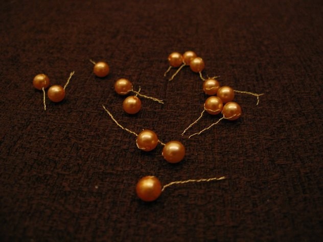 Так изготовила тычинки для цветов. Это бусинки и золотая проволочка.