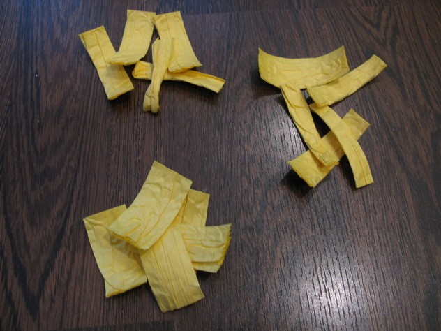 По замыслу цветочка будет три. Поэтому ленту делю на три части. Из каждой части должно получиться по 5 лепестков. Первую часть разрезала на полоски длинной 6,5 см, 2 — по 5,5 см, третью — по 4,5 см.